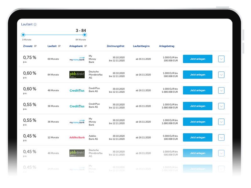 Der zinssatz gilt vom tag der einzahlung bis zum monatsende der vereinbarten dauer in monaten (festzinszeitraum).